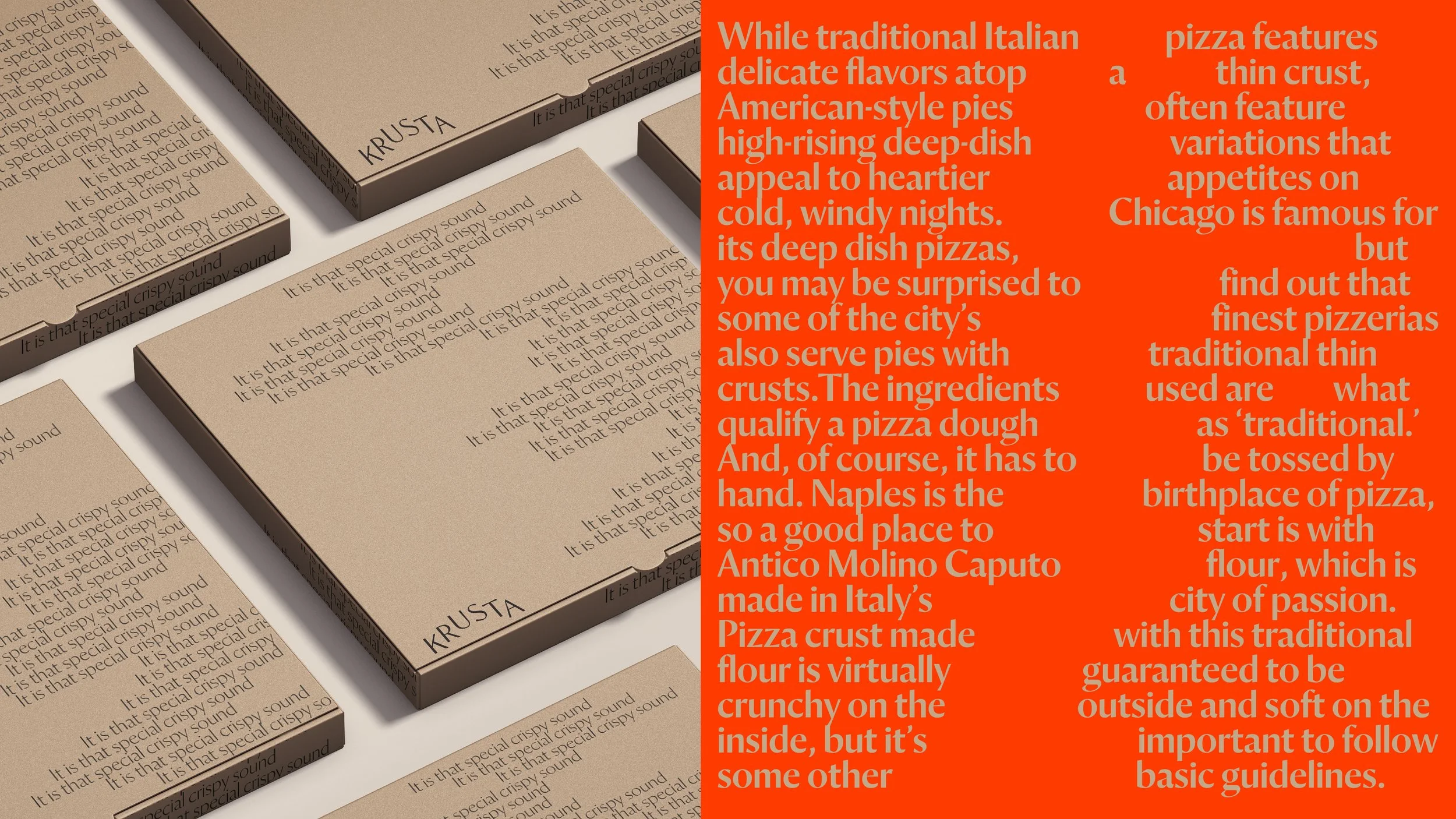 Our strategy involved conducting in-depth research on Dutch eating habits and brainstorming with Marialena Gousiou, my invaluable partner. Collectively, we uncovered a universal truth: the crust is the essence of an exceptional pizza. It's the distinguishing factor between a remarkable pizza and a mediocre one, providing that irresistible, crispy texture we all crave with the first bite. "Crusta" (or "Krusta" in transliteration) signifies more than just the outer layer of bread or pizza; it also embodies a protective shell or a snug, inviting space for relaxation.